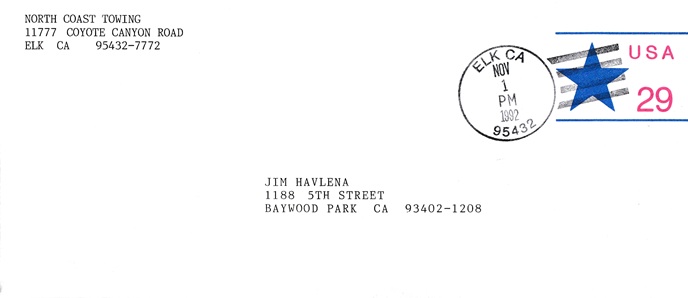 ![]() | Hand cancellation: "ELK, CA 95432 NOV 1 1992". |