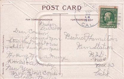 ![]() | Doane hand cancellation: "BADGER, CAL. DEC 25 1911 | 1 |". |