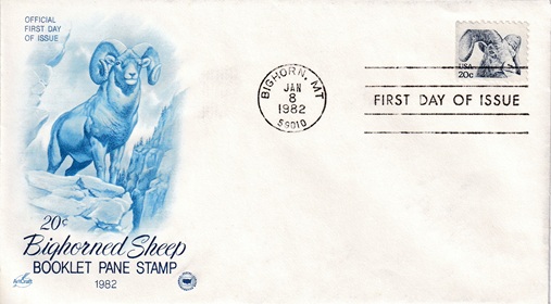 ![]() | Special hand slogan cancellation: "BIGHORN, MT 59010 JAN 8 1982 | FIRST DAY OF ISSUE |". |