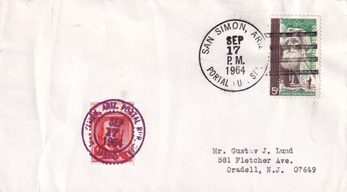 | Two different hand cancellations: "PORTAL RUR. STA., SAN SIMON, ARIZ. SEP 17 1964", and "PORTAL RUR. STA., SAN SIMON, ARIZ. USPO SEP 17 1964". |