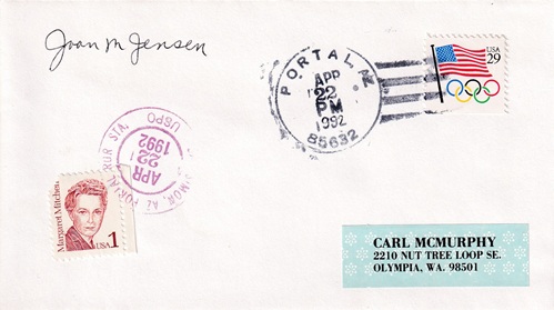 | Two different hand cancellations: "PORTAL, AZ 85632 APR 22 1992", and "PORTAL RUR. STA., SAN SIMON, ARIZ. USPO APR 22 1992". |