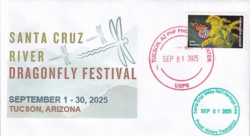 | This cacheted cover promotes the Santa Cruz River Dragonfly Festival. Hand cancellation: "PHF PHILATELIC CENTER, TUCSON, AZ USPS SEP 1 2025". |