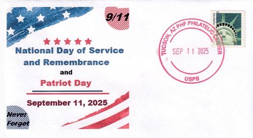 | This cacheted cover encourages participation in National Day of Service and Remembrance. Hand cancellation: "PHF PHILATELIC CENTER, TUCSON, AZ USPS SEP 11 2025". |