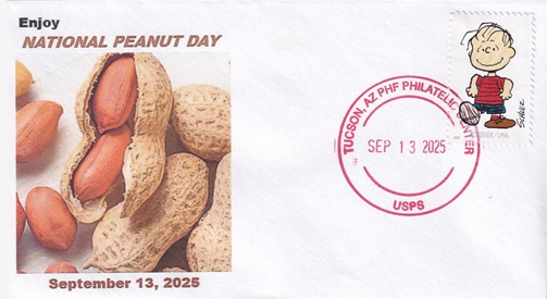 | This cacheted cover celebrates National Peanut Day! Hand cancellation: "PHF PHILATELIC CENTER, TUCSON, AZ USPS SEP 13 2025". |