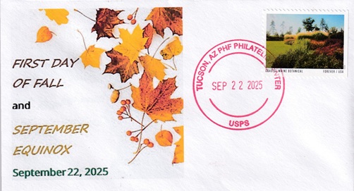 | This cacheted cover announces the first day of fall and the September Equinox. Hand cancellation: "PHF PHILATELIC CENTER, TUCSON, AZ USPS SEP 22 2025". |