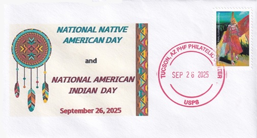 | This cacheted cover celebrates National Native American Day. Hand cancellation: "PHF PHILATELIC CENTER, TUCSON, AZ USPS SEP 26 2025". |