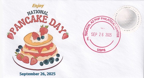 | This cacheted cover features National Pancake Day. Hand cancellation: "PHF PHILATELIC CENTER, TUCSON, AZ USPS SEP 26 2025". |