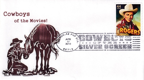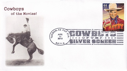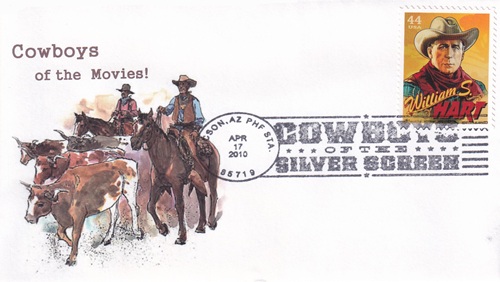 | These four cacheted covers feature cowboys in the movies. Special hand pictorial & slogan cancellations: "PHF STA., TUCSON, AZ 85719 APR 17 2010 | COWBOYS OF THE SILVER SCREEN |". [TPS] |