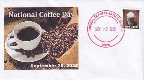 | This cacheted cover is for National Coffee Day. Hand cancellation: "PHF PHILATELIC CENTER, TUCSON, AZ USPS SEP 29 2025". |