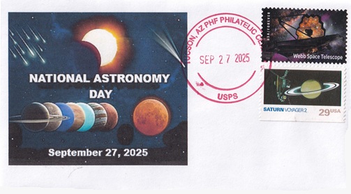 | This cacheted cover features National Astronomy Day. Hand cancellation: "PHF PHILATELIC CENTER, TUCSON, AZ USPS SEP 27 2025". |