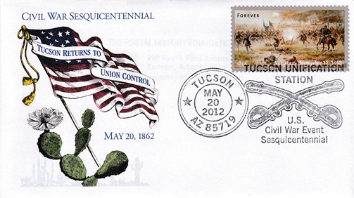 | These two cacheted covers commemorate the U. S. Civil War in Tucson. Special hand pictorial & slogan cancellations: "TUCSON UNIFICATION STATION, TUCSON, AZ 85719 MAY 20 2012 | U.S. Civil War Event Sesquicentennial |". [TPS] |