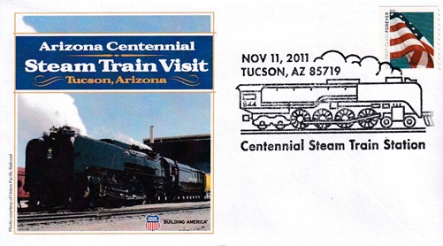 | This cacheted cover welcomes the Centennial Steam Train visit to Tucson. Special hand pictorial cancellation: "Centennial Steam Train Station, TUCSON, AZ 85719 NOV 11, 2011". [TPS] |