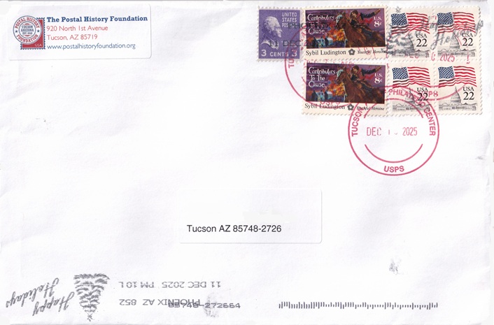 | Hand cancellation: "PHF PHILATELIC CENTER, TUCSON, AZ USPS DEC 10 2025". |