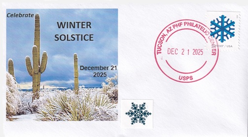 | This cacheted cover celebrates the Winter Solstice of 2025. Hand cancellation: "PHF PHILATELIC CENTER, TUCSON, AZ USPS DEC 21 2025". |