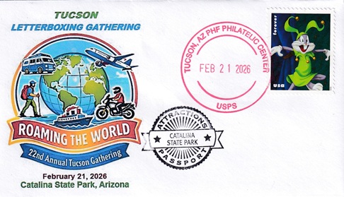 | This cacheted cover celebrates the "2026 Tucson Letterboxing Gathering". Hand cancellation: "PHF PHILATELIC CENTER, TUCSON, AZ USPS FEB 21 2026". |