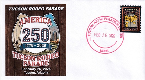 | This cacheted cover is for the annual "Tucson Rodeo Parade". Hand cancellation: "PHF PHILATELIC CENTER, TUCSON, AZ USPS FEB 26 2026". |