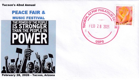 | This cacheted cover promotes the "Tucson Peace Fair. Hand cancellation: "PHF PHILATELIC CENTER, TUCSON, AZ USPS FEB 28 2026". |