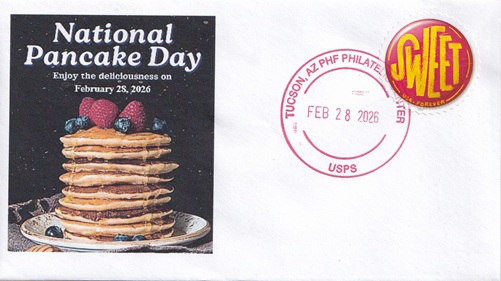 | This cacheted cover celebrates "National Pancake Day. Hand cancellation: "PHF PHILATELIC CENTER, TUCSON, AZ USPS FEB 28 2026". |