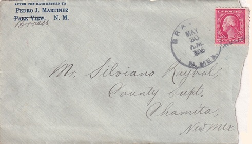 | Hand cancellation: "BRASOS, N. MEX. MAY 30 1916". |