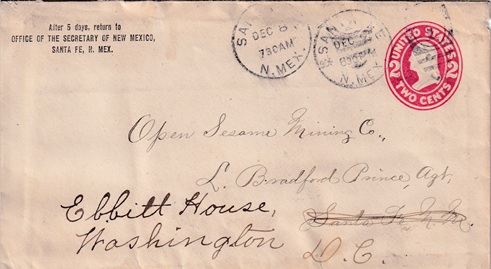 ![]() | Hand cancellation on back: "REC'D., SANTA FE, N.MEX. DEC 10 1904". [TPC] |