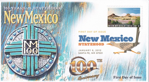 ![]() | This cacheted cover is for the first day of issue of the New Mexico Statehood centennial forever postage stamp. Special machine slogan cancellation: "SANTA FE, NM 87501 JAN 6 2012 | FIRST DAY OF ISSUE |". |