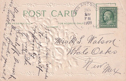 | Hand cancellation: "SAN ANTONIO, N. MEX. JAN 29 1909". [TPC] |