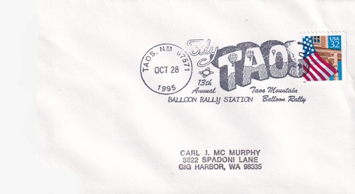 | Special hand pictorial & slogan cancellation: "BALLOON RALLY STATION, TAOS, NM 87571 OCT 28 1995 | Fly TAOS 13th Annual Taos Mountain Balloon Rally |". |