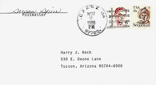 | Hand cancellation: "YELLOW JACKET, CO 81335 AUG 18 1988". |