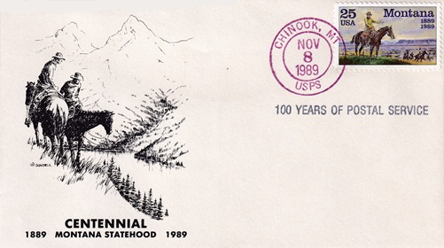 | Hand cancellation: "CHINOOK, MT USPS NOV 8 1989". |