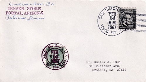 |  | Two different hand cancellations:  "PORTAL RUR. STA., SAN SIMON, ARIZ. FEB 14 1967", and "PORTAL RUR. STA., SAN SIMON, ARIZ. USPO FEB 14 1967". |