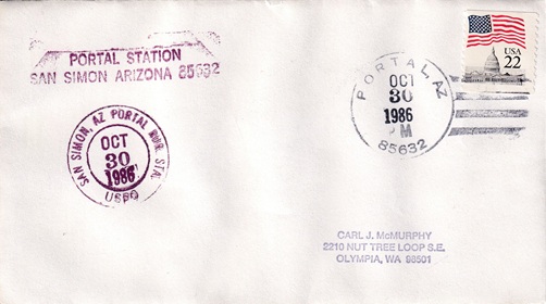 |  | Two different hand cancellations:  "PORTAL, AZ 85632 OCT 30 1986", and "PORTAL RUR. STA., SAN SIMON, ARIZ. USPO OCT 30 1986". |