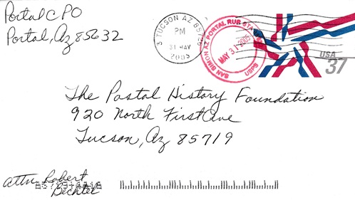 |  | Hand cancellation:  "PORTAL RUR. STA., SAN SIMON, AZ 85632 USPS MAY 16 2001". |