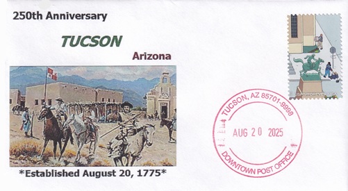 ![]() | This cacheted cover commemorates Tucson's 243rd birthday and is also for the first day of issue of the special Tucson 1775-2018 50 cents postage stamp. Special hand pictorial & slogan cancellation: "OLD PUEBLO STATION, TUCSON, AZ 85719 AUGUST 20 2018 | 243 YEARS TUCSON BIRTHDAY 1775-2018 |". |