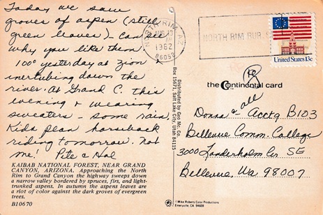 Hand cancellation: "NORTH RIM, ARIZ. JUN 7 1948". [This was sent by my aunt to my grandparents!]