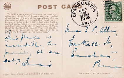 Hand cancellation: "GRAND CANYON, ARIZ. OCT 18 1915".