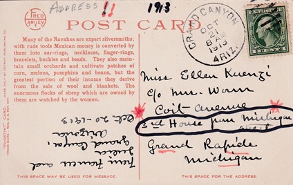 Hand cancellation: "GRAND CANYON, ARIZ. OCT 21 1913".