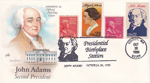 | Special hand pictorial & slogan cancellations: "Presidential Birthplace Station, QUINCY, MA 02169 OCT 30 1986 | JOHN ADAMS - OCTOBER 30, 1735 |". |
