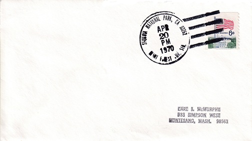 | Special machine slogan cancellation: "YELLOWSTONE PK, WY 82190 MAR 1 1972 | NATIONAL PARKS CENTENNIAL YEAR 1872 - 1972 |". |