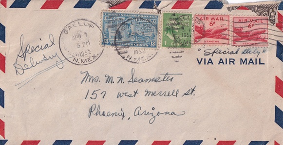 | Hand cancellation: "CHURCH ROCK, N. MEX. JUL 1 1952". |