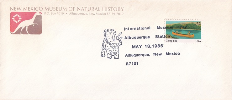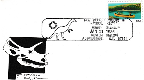 | Special hand pictorial & slogan cancellations: "MUSEUM STATION, ALBUQUERQUE, N.M. 87101 JAN 11 1986 | NEW MEXICO MUSEUM OF NATURAL HISTORY GRAND OPENINGG |". |