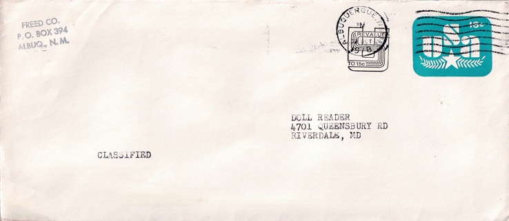 ![]() | Hand cancellation on back: "REGISTRY SEC., ALBUQUERQUE, NM USPO AUG 23 1979". |