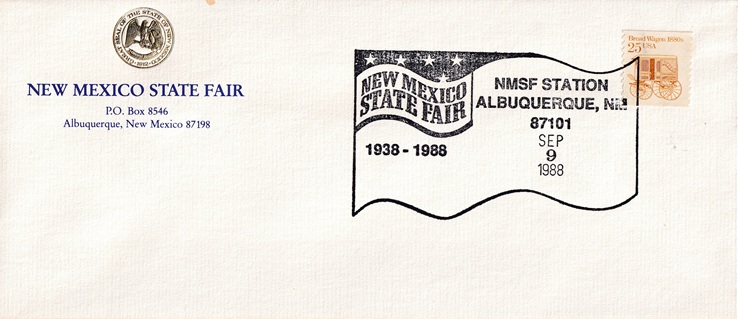 ![]() | Special hand pictorial & slogan cancellation: "NMSF STATION, ALBUQUERQUE, NM 87101 SEP 9 1988 | NEW MEXICO STATE FAIR 1938 - 1988 |". |