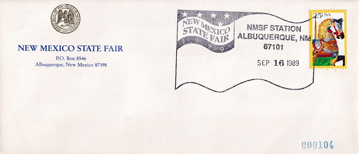 ![]() | Special hand pictorial & slogan cancellation: "NMSF STATION, ALBUQUERQUE, NM 87101 SEP 9 1989 | NEW MEXICO STATE FAIR 1989 |". |