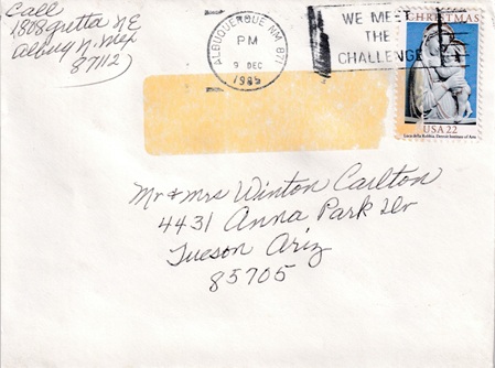![]() | Hand cancellation: "STA. NO. 9, ALBUQUERQUE, N.MEX. USPO DEC 21 1987". |