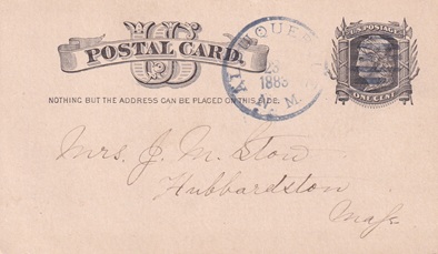 ![]() | Hand cancellation: "ALBUQUERQUE, N.MEX. JAN 27 1884". [TPC] |