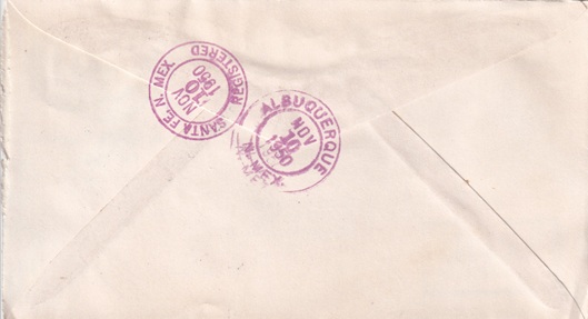 ![]() | Hand cancellation on back: "ALBUQUERQUE, N.MEX. NOV 10 1950". Has "REGISTERED NO." and "Return Receipt Requested. Fee Paid:" auxiliary markings on front. |