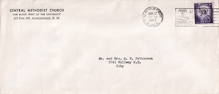 ![]() | Machine pictorial & slogan cancellation: "ALBUQUERQUE 1, N.MEX. MAR 22 1957 | AT EASTER HELP CRIPPLED CHILDREN |". |