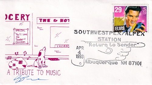 ![]() | This cacheted cover is for the first day of issue of the Elvis 29 cents postage stamp. Special hand pictorial cancellation: "The Legend Lives On (STATION), ALBUQUERQUE, NM 87101 USPS JAN 8 1993". |