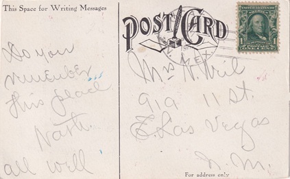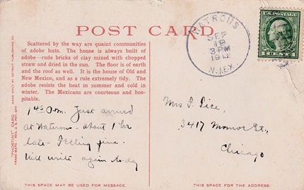 | Hand cancellation on back: "REC'D., MORA, N.MEX. SEP 14 1908". [TPC] |