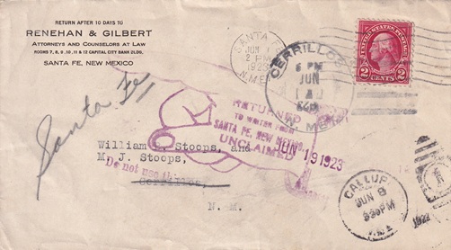 Hand cancellation: "CERRILLOS, N. MEX. JUN 7 1923". Has "RETURNED TO WRITER FROM SANTA FE, NEW MEXICO. UNCLAIMED" pointing hand auxiliary marking.